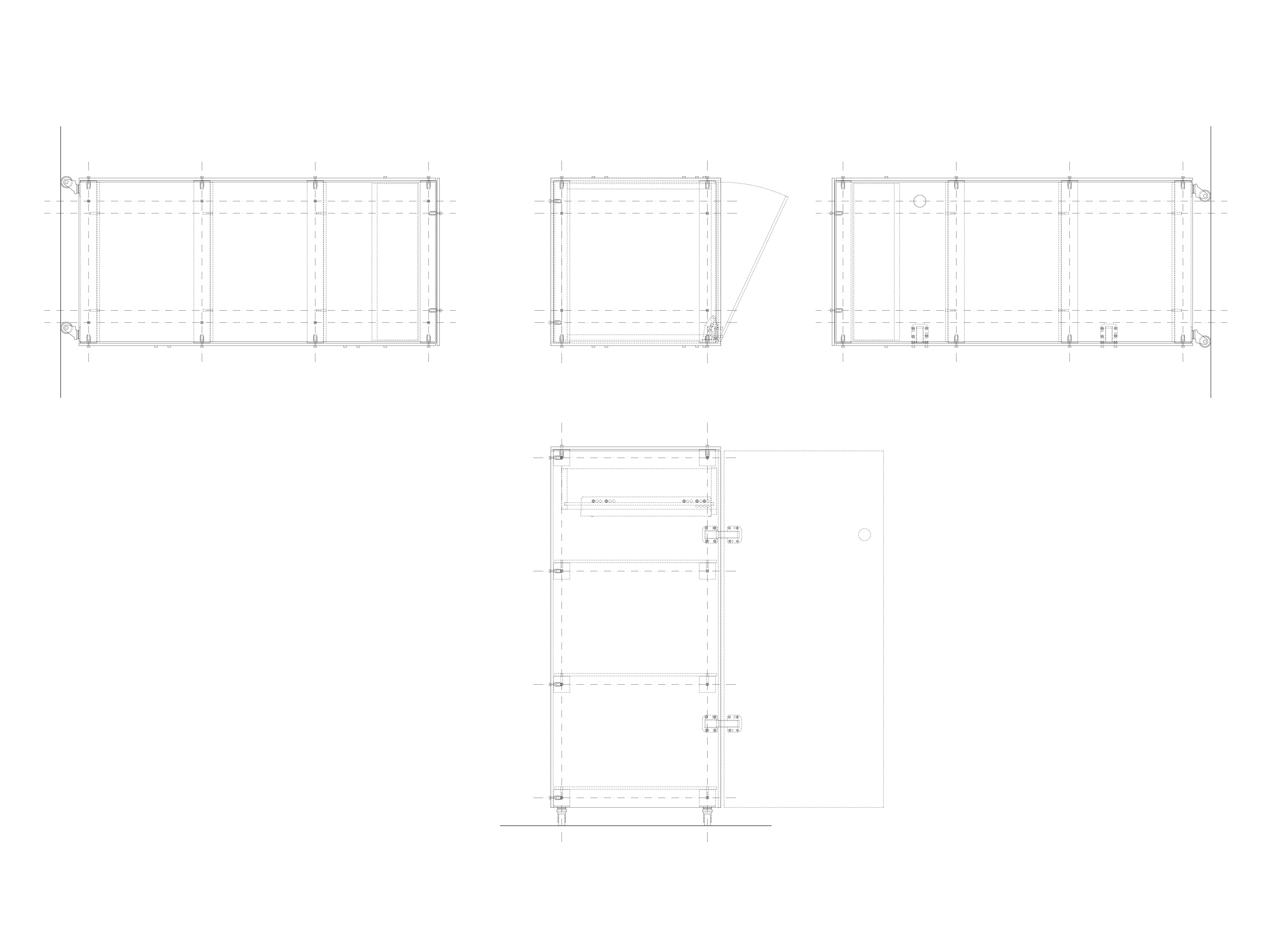 Die Konstruktion aus Plexiglas, Holz und Edelstahl bildet eine Familie aus Möbeln: hohe, lange, niedrige, aufklappbare Schränke organisieren alle Anforderungen des Alltags in der Kanzlei.